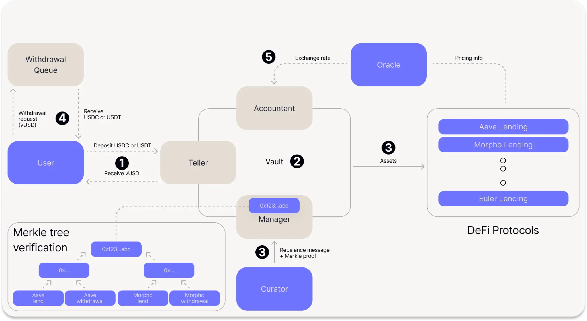 通过抽象化处理跨链操作、收益优化和风险缓释等复杂流程, Veda 大幅降低了消费者和机构参与链上金融的门槛。集成 Veda 的协议可为用户提供实时且透明的安全保障,实现无缝接入。