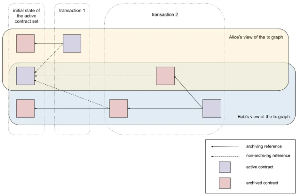 系统中所有处于活跃状态的合约被称为“活跃合约集”( Active Contract Set , ACS ),其状态由交易图生成。每笔交易都可以创建或归档合约,同时引用其所依赖的合约。新交易作为原子性更改,附加在交易图的末尾,并可能包含多个子交易,不同参与方将看到不同的子交易内容,因此每个参与方所观察到的 ACS 是全局 ACS 的一个子集。
