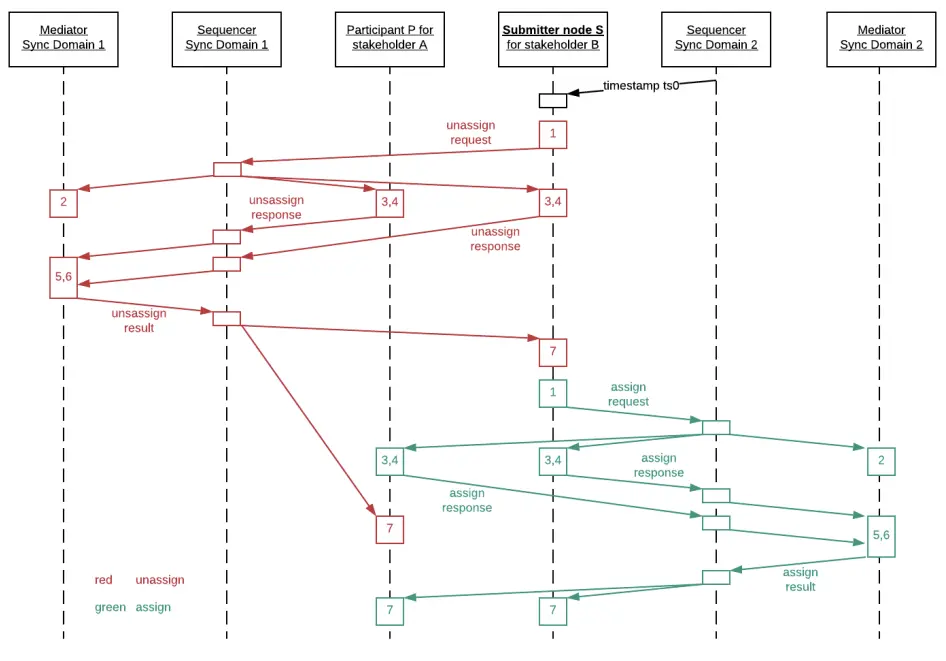 图 4:同步域重新分配的序列图。合约签署方可以共同同意将某合约的同步职责从一个同步域(及其对应的 CSP )转移到另一个同步域。