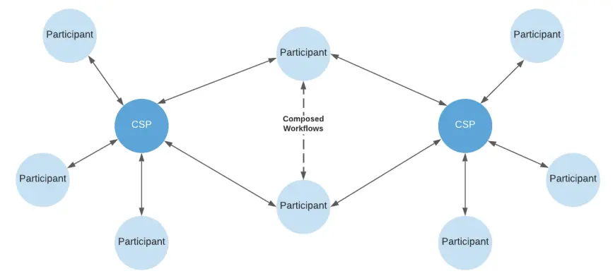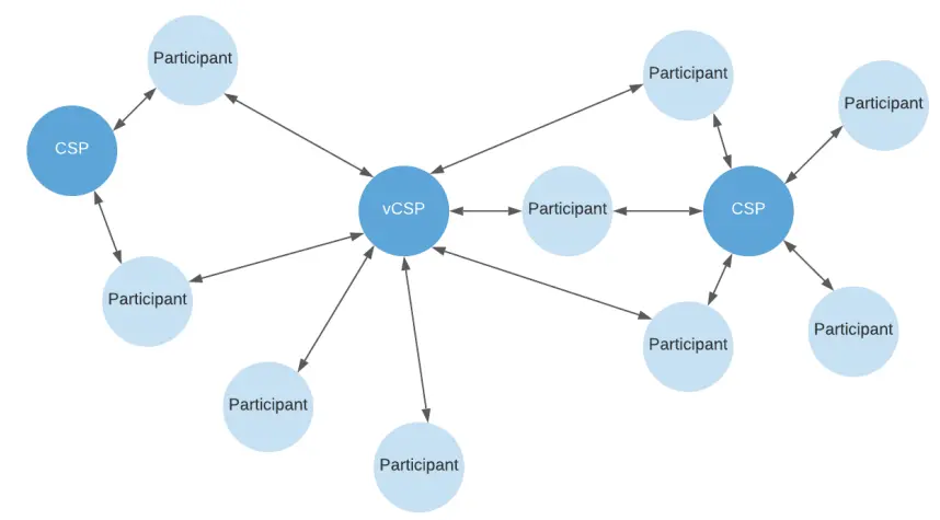 图 3: Canton 网络拓扑结构。各参与方通过 Canton 服务提供商( CSP )或由联盟组成的虚拟 CSP (v CSP )相互连接。只要参与方的节点连接到同一个 CSP 或 v CSP ,便可进行交易。网络中不存在任何一个节点需要处理全部交易的情况。