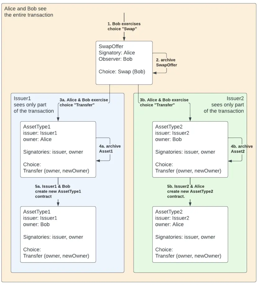 图 5:原子资产交换交易。只有当所有签署方同意两个子交易时,资产交换才会成功,否则交易被拒绝,资产不会转移。 Alice 和 Bob 可查看完整交易内容,而发行方 1 和 发行方 2 仅有权查看交易的部分内容。