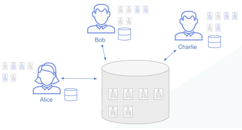 Daml 的账本数据模型采用不同于传统区块链的方式,以解决隐私性和可扩展性的问题。在 Daml 模型中,账本并不会在所有参与方之间完全复制,而是根据隐私规则进行分片,每个参与方仅存储与自身相关的“视图”或“账本片段( shard )”。因此,网络中不存在一个所有人共享的账本副本,而是每个参与方都有一个只包含其自身合约的账本。交易发生时,只有交易的相关方会更新各自的账本视图。