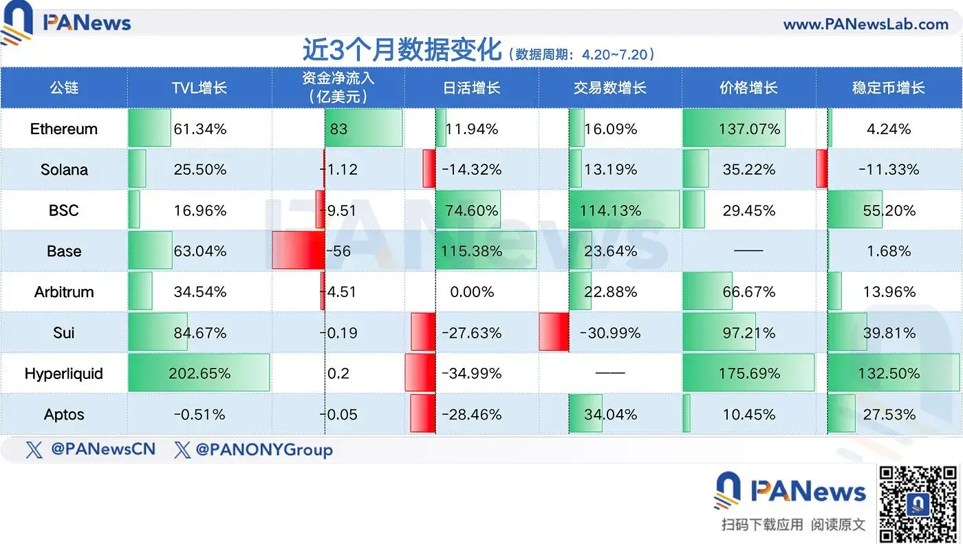 盘点 8 个主流公链近 3 个月数据表现:以太坊王者归来,Base、Hyperliquid 数据飙升