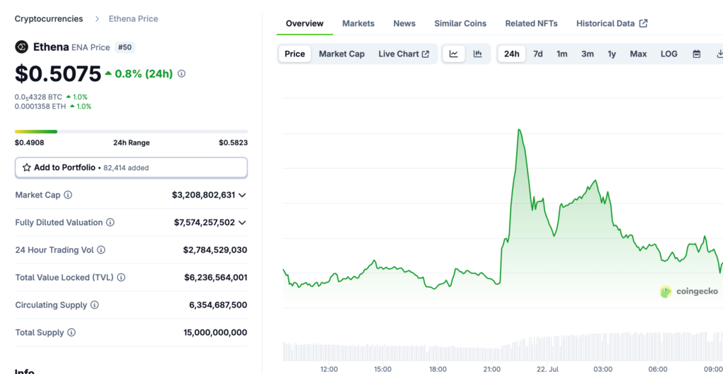 据 Coingecko 数据 显示 ,受此消息激励,ENA 币价在近 24 小时内一度上涨了 16%,币价最高达到 0.581 美元,撰稿当下暂报 0.5075 美元,市值约为 32.08 亿美元。
