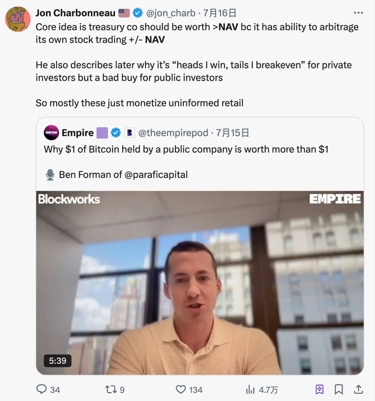 这就反映了市场溢价,即市场如果认为比特币未来还会涨,那么投资者就会将这一预期计入股价,使其股价原高于 NAV。
