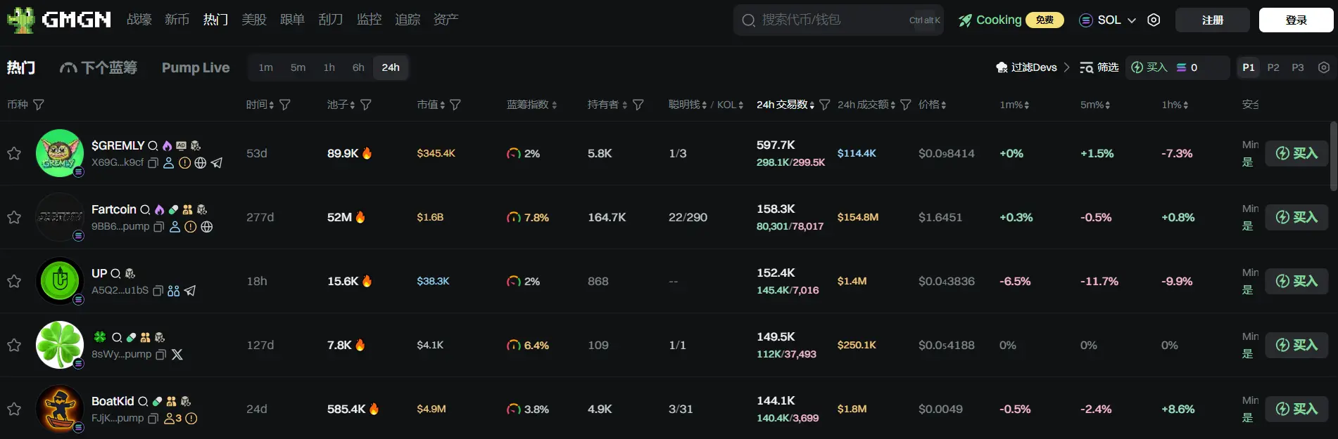 过去 24h Solana 热门代币前五依次为:$GREMLY、Fartcoin、UP、 ? 、BoatKid