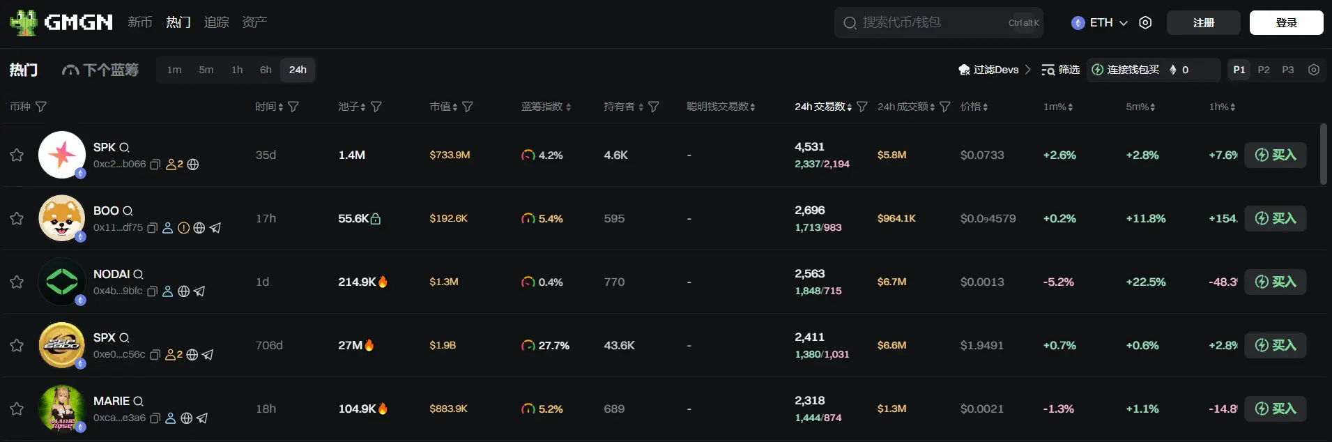 过去 24h 以太坊热门代币前五依次为:SPK、BOO、NODAI、SPX、MARIE