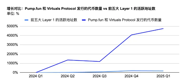 自 2024 年 Q1 起,随着 Pump.fun、BONK 的 LetsBonk 和 Raydium Launchpad 等工具和平台的出现,发行代币的门槛大幅降低。AI 驱动的智能代币进一步加速了这一趋势。代币发行量已较 2024 年 Q1 增长超 50 倍,而主流 Layer1 的活跃钱包数量也翻了一番。但代币的曝光机制未能同步扩展,导致早期项目难以获得关注。
