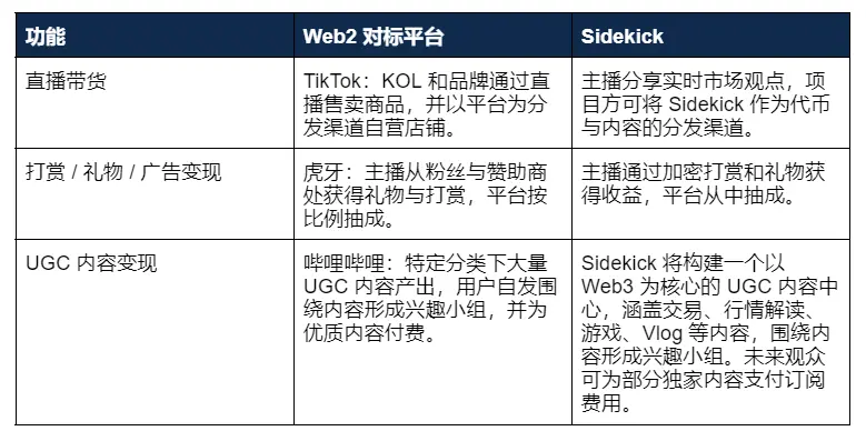 Sidekick 构建的“信任-行动”闭环源于产品设计:既吸收了 Web2 平台的互动机制,又具备 Web3 的交易能力。它融合了 TikTok、虎牙与哔哩哔哩的核心功能: