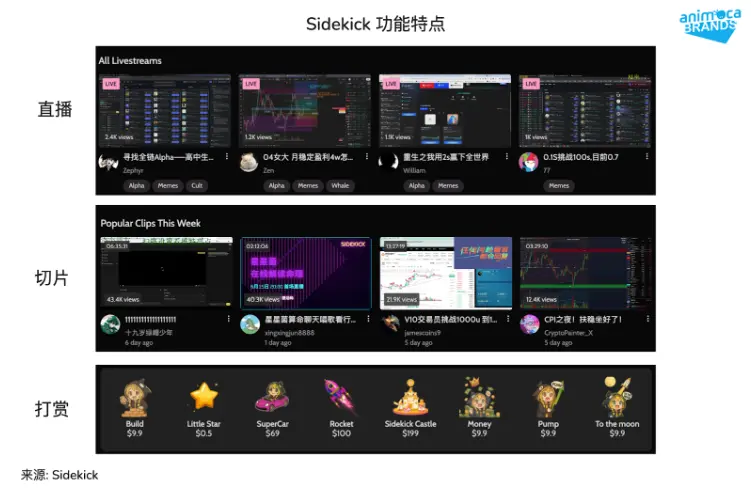 Sidekick 是一个围绕直播内容构建的 Web3 内容平台,涵盖市场评论、链游等内容。它将“直播电商”的模式应用到加密市场中,打造 LiveFi 基础设施,使 KOL、交易者与项目方在同一个空间内互动。