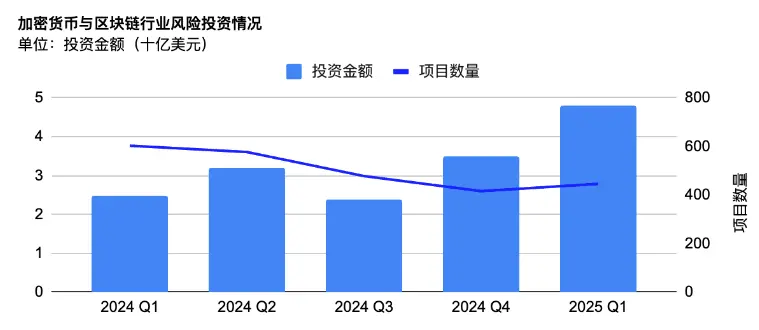 在机构层面,从 2024 年 Q1 到 2025 年 Q1,VC 投资金额持续增长,但资金越来越集中在少数明星项目上。这些项目由于估值与流动性压力,也对市场关注度提出更高要求。