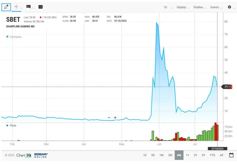 2025 年 7 月 15 日,一个惊人的消息引爆市场:濒临退市的游戏公司 SharpLink 宣布,将一周内筹集到的 4.13 亿美元全部买入以太坊。资本市场对此给出了最狂热的回应 —— 根据 Investing 和 Nasdaq 的数据,其股价在六个月内暴涨 528% ,单月飙升超过 150% 。