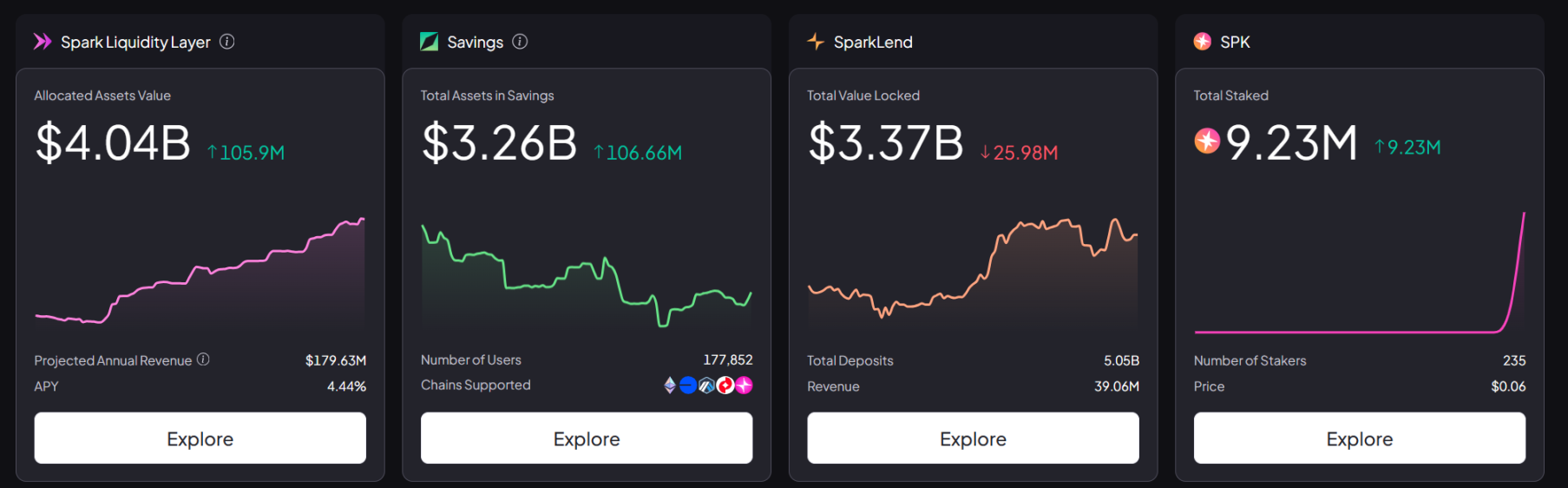 Spark 是链上金融的流动性和收益基础设施层。自 DeFi 诞生以来,加密市场就存在着难解的结构性问题:流动性非常分散以及收益不稳定,虽然多年来 DeFi 不断发展,但这一问题仍未得到解决。Spark 相当于链上资产配置器,在生态系统方面,它从 Sky 价值超过 65 亿美元的稳定币储备中借款,并将资本部署到 DeFi、CeFi 和 RWA。Spark 为市场提供稳定的流动性,同时实现了大规模的风险调整后收益。