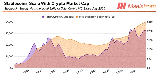 平均而言,加密货币总市值每增加 1 美元,就有 0.09 美元流入稳定币。让我们假设川普尽职尽责,到 2028 年他离任时,将加密货币总市值推高到 100 兆美元。这比当前水平上涨了大约 25 倍;