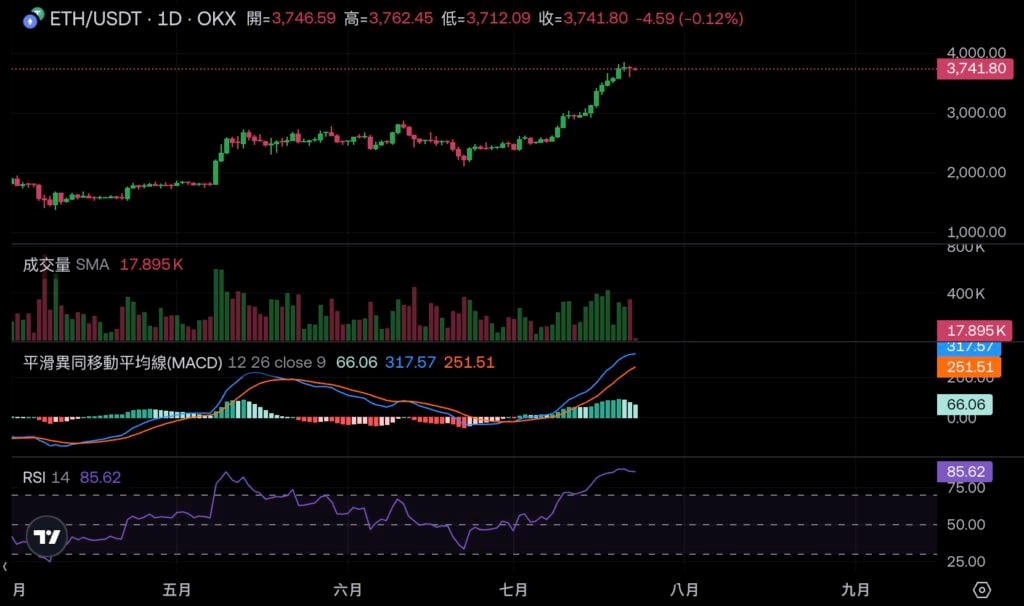 至于技术面上,目前 ETH 日缐图的相对强弱指数(RSI)已处于 85 的超𧹒区,分析师提醒若跌破移动平均缐并自超𧹒区回落,ETH 可能回测 3,470 美元支撑区,进一步下行则关注 3,200 美元。而若维持走高趋势,那下个目标为则在 4100 美元。