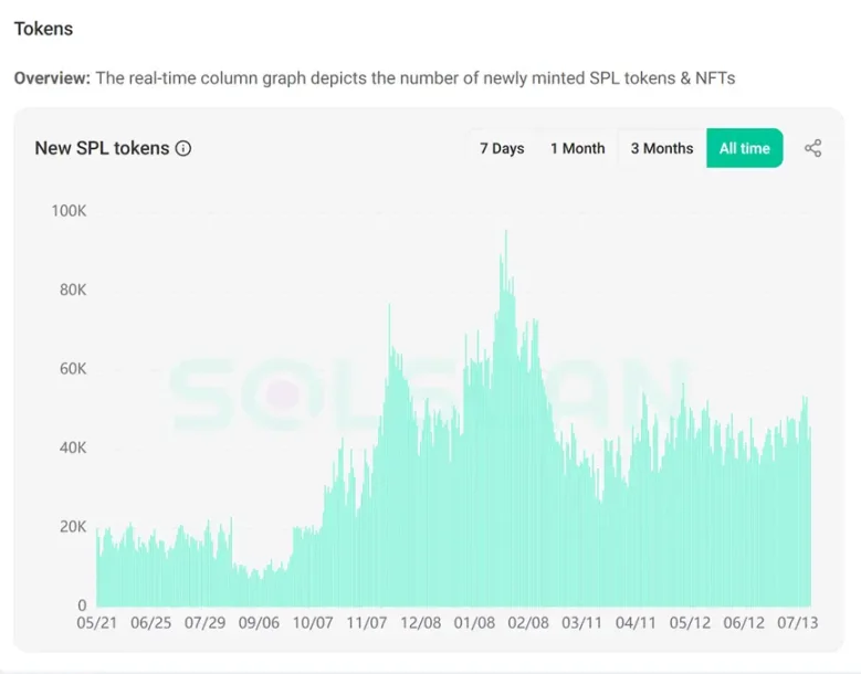 在 MEME 币方面,当前的 Solana 每日新代币发行量约为 4 万到 5 万个,相比今年 1 月的 9 万到 10 万水平有了明显下滑。不过,总体上仍处于相对稳定的状态,并未出现断崖式的下跌。