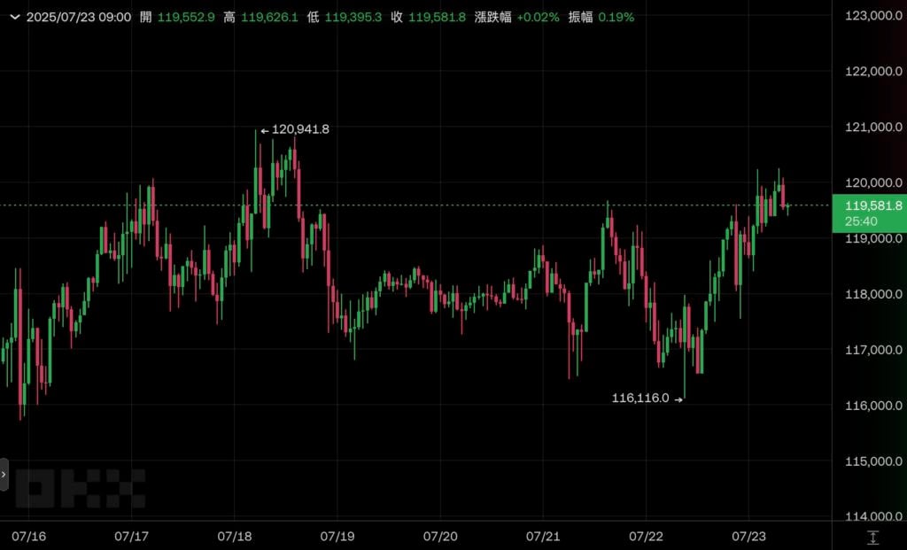 至于加密市场的风向标,比特币价格昨日一度逼近 11.6 万美元后持续回弹,今(23)日稍早曾短暂突破 12 万美元,截稿前暂报 119,581 美元,持续高位盘整。