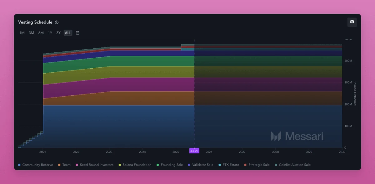 根据 Messari 数据, 99.88% 的 SOL 解锁已完成。目前“锁定”的代币仅有 60 万枚 SOL, 由 FTX 持有(或已在场外交易中出售)。