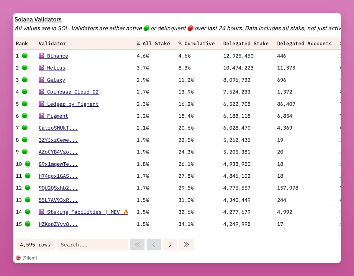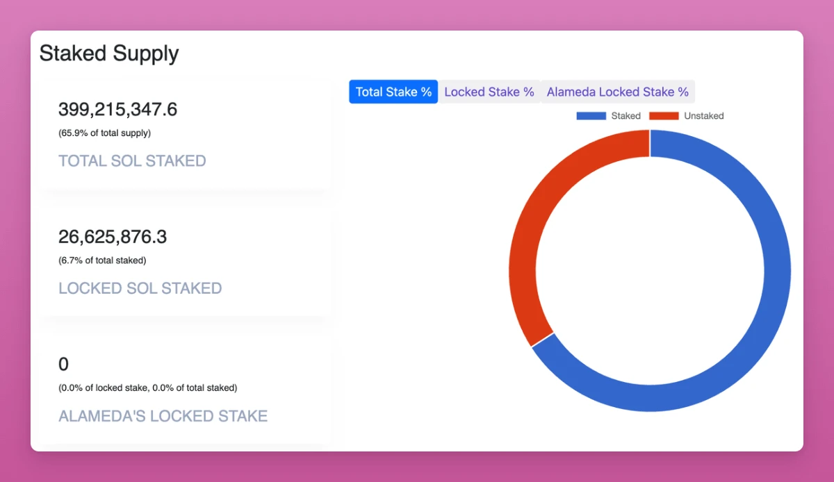 Solanacompass 数据显示, 6.7% 的 SOL 正在被锁仓质押,或为风投/团队/内部人士行为,但我无法弄清这部分 SOL 的持有人具体是谁。