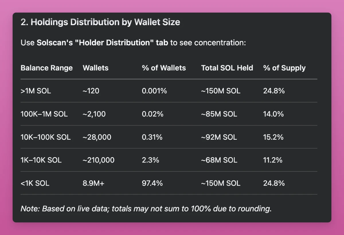散户主导地位: 97.4 %的钱包持有少于 1000 枚 SOL,共占 24.8 %的供应量。