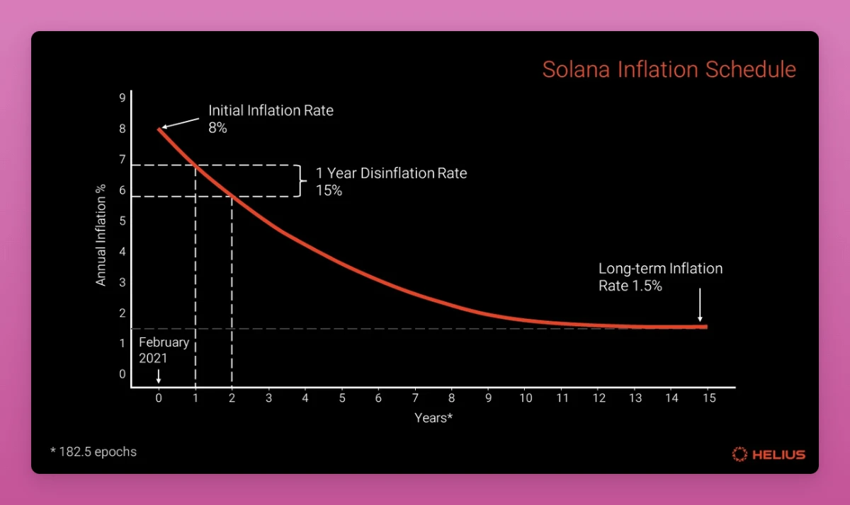 需要注意的是,Solana 的总供应量没有上限(像 ETH 一样 ), 通胀率为 4.395% ,年通缩率为 15% ,最终通胀率应稳定在 1.5% 。