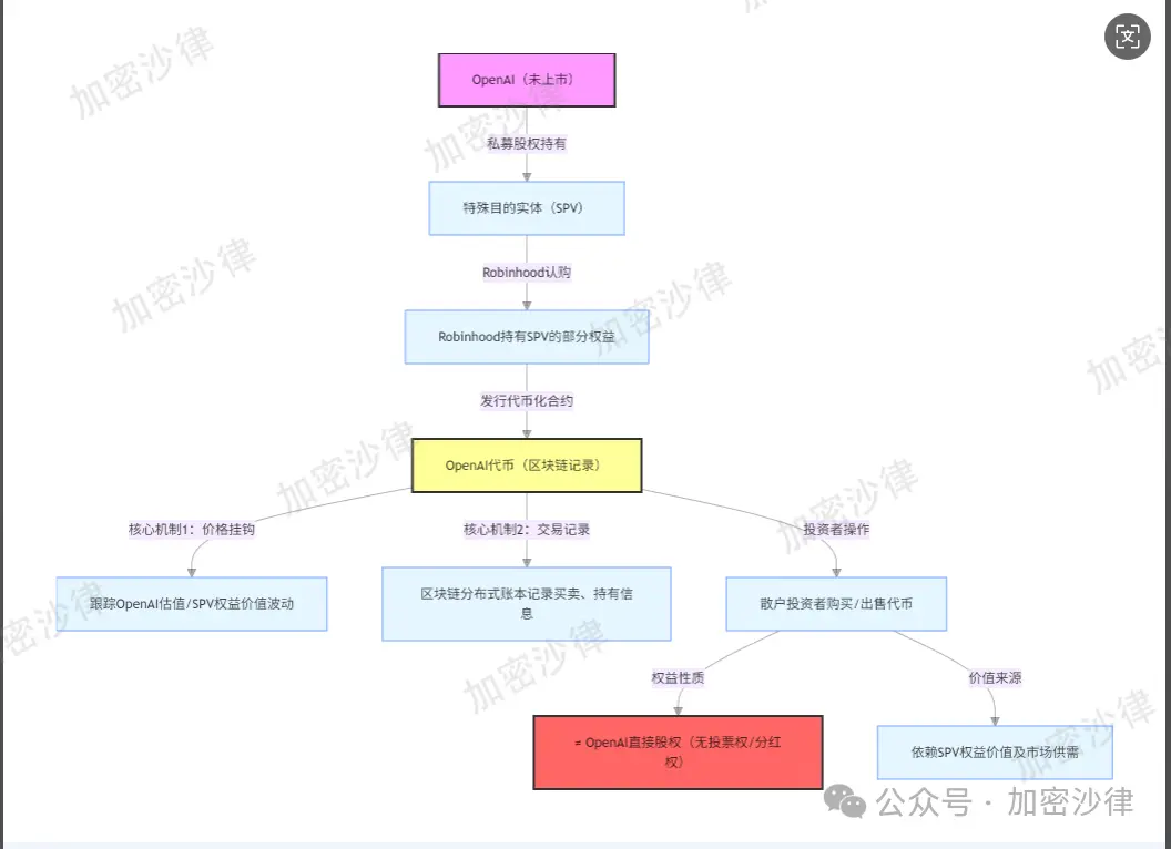 再回到 OpenAI 与 Robinhood 的说辞,OpenAI 否认的是 “代币 = 股权”,强调未授权任何股权关联产品,这与流程中 “代币≠直接股权” 一致;Robinhood 承认代币是“挂钩价格的合约”,与流程中 “通过 SPV 间接挂钩价值” 的设计一致。双方争议点在于 “这种间接挂钩是否合法合规”,而非流程本身的事实描述。