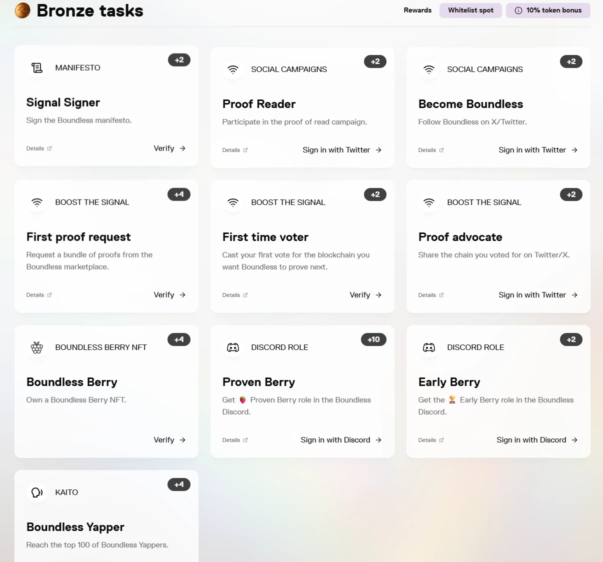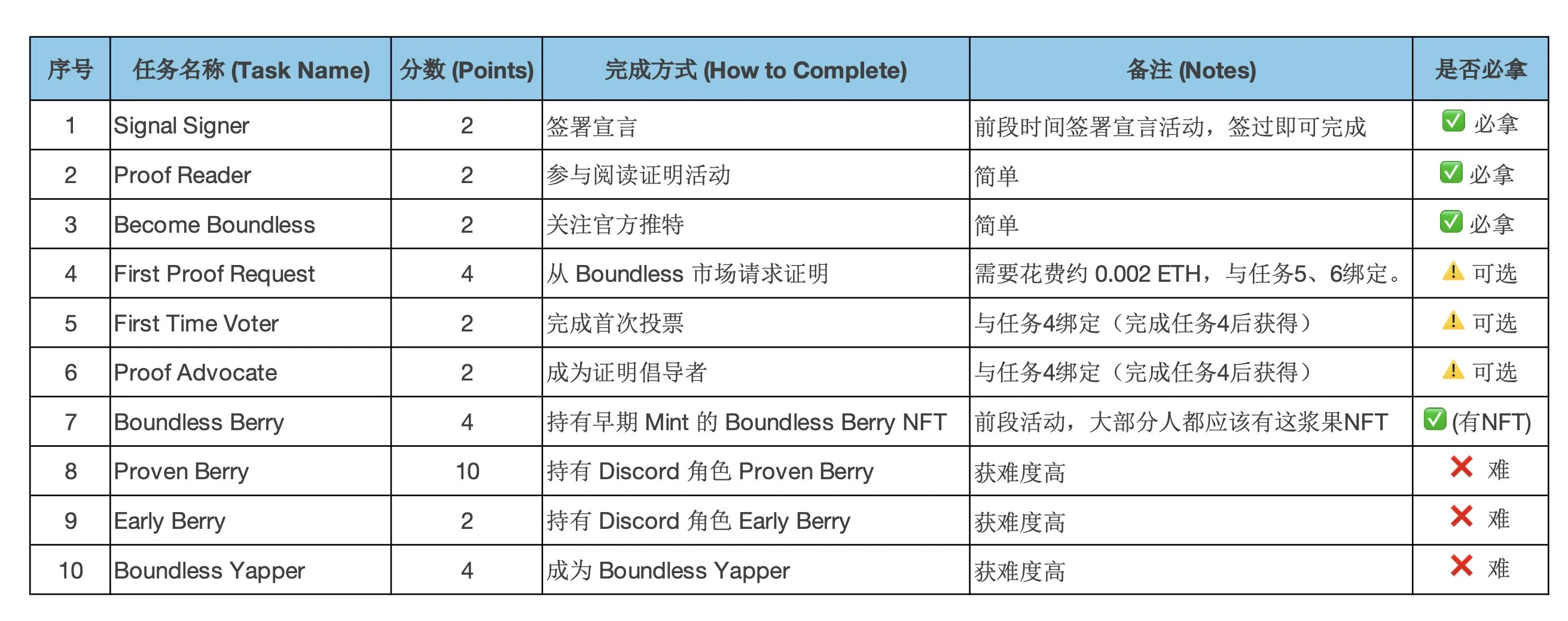 7 月 16 日,Boundless 在 X 平台发文宣布主网 Beta 版现已上线,完成相关任务即可获得 Boundless 代币销售白名单以及额外代币奖励,任务分为铜牌、银牌、金牌、钻石四个级别任务,目前已解锁铜牌与银牌任务。 此外,值得一提的是, 主网 Beta 版之后将会上线最终主网。