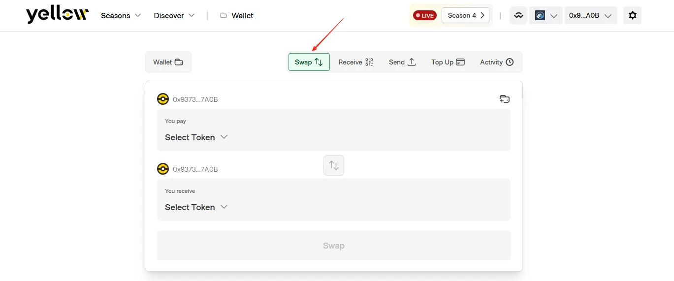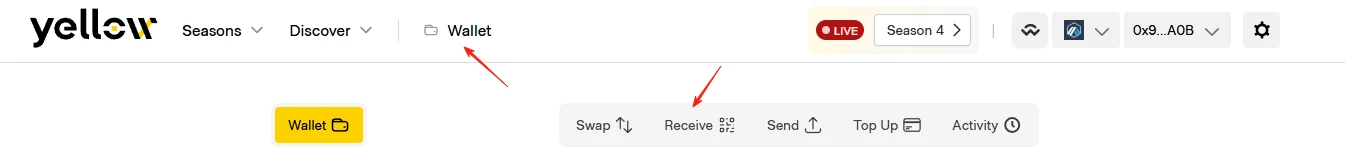 STEP 3. 点击“Wallet”后点击“Receive”将资产转入到 Yellow 平台中。