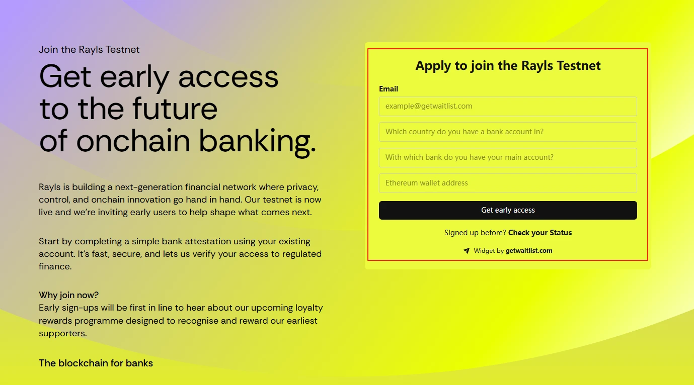 STEP 1. 进行候补名单登记(链接: https://rayls.com/testnet ),需要填写个人邮箱、个人钱包地址以及两个简单问题后点击“Get early access”即可,目前候补名单共计 53.7 万人。