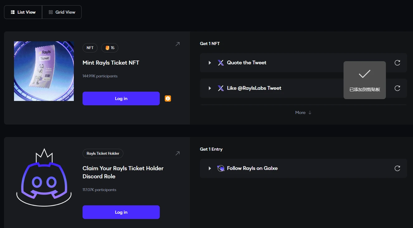 STEP 3. 完成 Galxe 上另一个任务(链接: https://app.galxe.com/quest/degf5vaoivxjsc6t7KimCy/GCzdVtm92X ),为:Enter the Rayls,通过完成社交类任务,领取 NFT 和 Discord 角色。