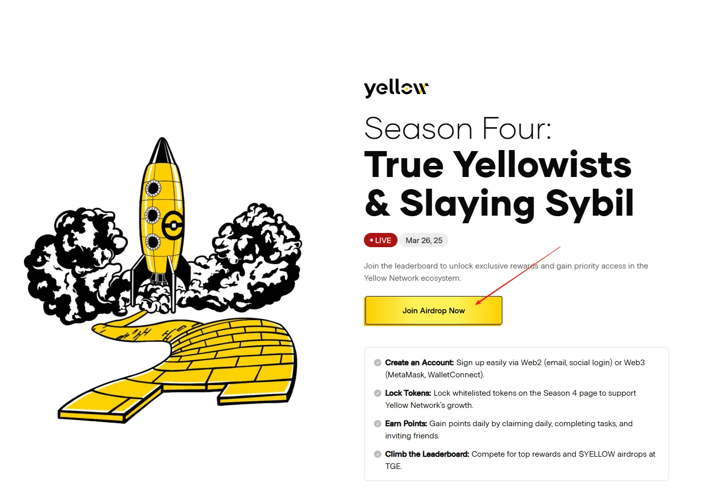 STEP 1. 进入交互网站(链接: https://yellow.com/airdrop ),并点击“Join Airdrop Now ”通过谷歌邮箱进行账号登录。