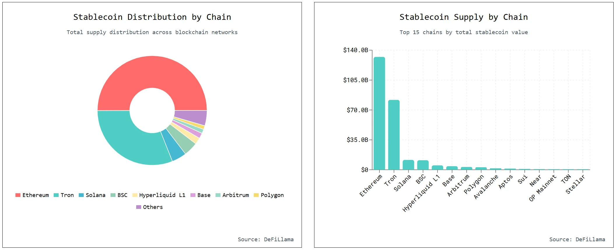 从稳定币的分布与供应来看,Tron 仅略低于以太坊。相较于其他公链,二者在市场份额上的占比遥遥领先。
