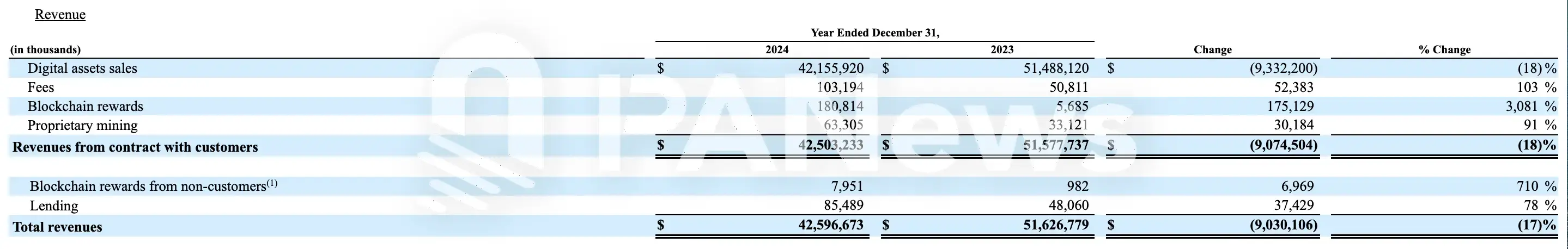 事实上,Galaxy 正试图以更为多元的结构性战略应对高波动、高不确定性的加密市场环境。 目前,Galaxy 的业务架构主要围绕三大核心板块展开:全球市场(涵盖交易及投资银行业务)、资产管理,以及数字基础设施解决方案(包括挖矿、质押协议支持和自托管技术)。其中,交易业务是 Galaxy 的营收基石。根据招股书披露, 2024 年 Galaxy 总收入逼近 426 亿美元,其中约 99% 来自数字资产交易业务。但这种单一结构在市场下行周期中暴露出显著风险。