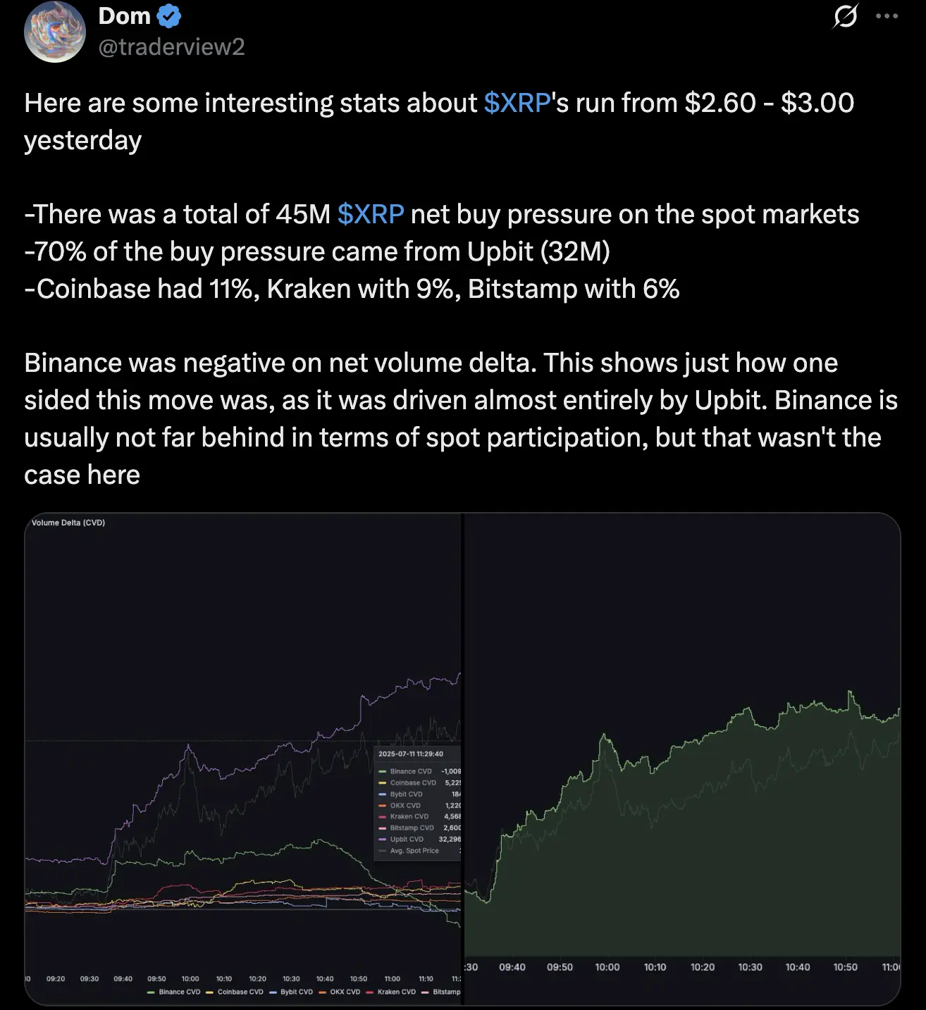 根据分析师 Dom 在社群媒体平台 X 上分享的资料,当天代币价格在数小时内从 2.60 美元上涨至 3.00 美元,现货市场对 XRP 的净𧹒入压力总计 4,500 万,其中 70% 来自 Upbit(3,200 万),Coinbase 占 11%,Kraken 占 9%,Bitstamp 占 6%。这次上涨几乎完全由南韩𧹒盘推动。