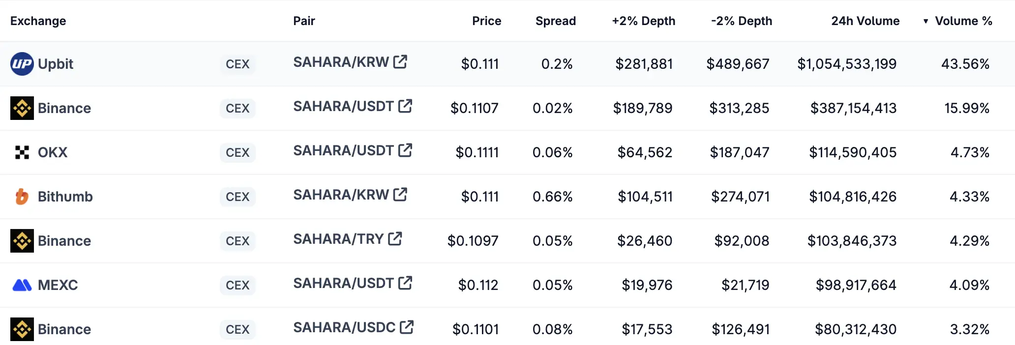 7 月 23 日,「AI 原生」全栈区块链平台 Sahara AI 的 SAHARA 代币掀起第二波高潮。据 PANews 报导,SAHARA 当日最高涨幅高达 86%,在 Upbit 现货市场交易量中排名第三,占平台总交易量的 8.76%。今日韩国投资者对 SAHARA 交易热情依旧高涨。截至 7 月 24 日晚间 8 点,过去 24 小时交易量达 23 亿美元,现货交易 43.56% 来自 Upbit,另有 4.33% 来自 Bithumb。