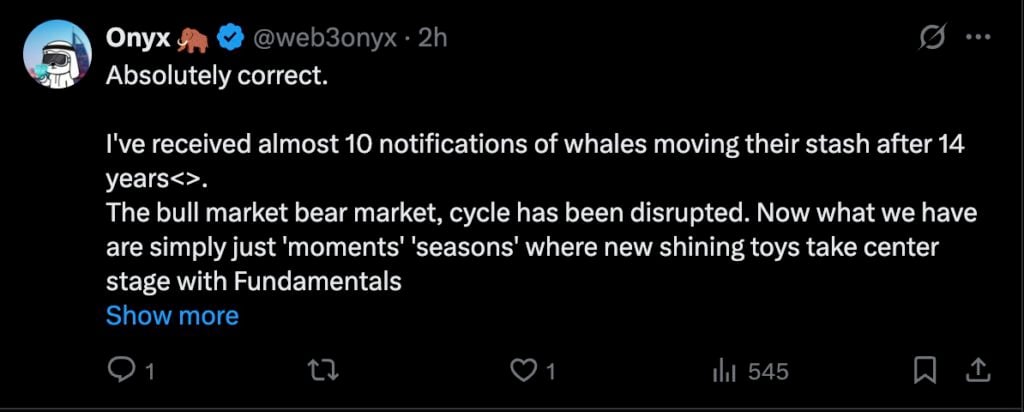 这一观点获得不少圈内人士认同。Onyx 指出,近期有多笔长达 14 年未动的比特币资金𫔭始转移,传统的牛熊周期已被打乱,现在市场更像是「时刻」或「季节」轮动,由新题材主导。