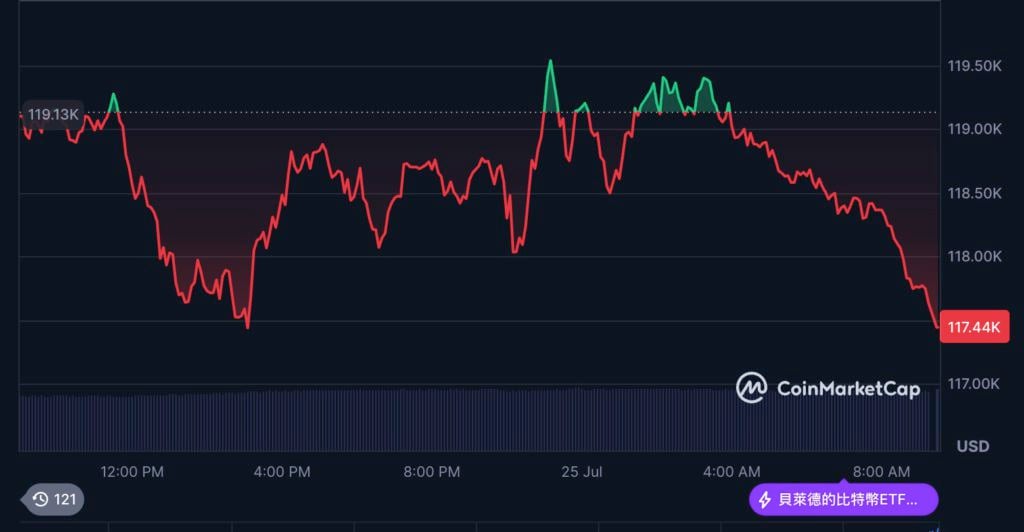 比 特币昨晚一度站上 119,500 美元之后,清晨再度震盪走低,撰稿当下报 117,440 美元,近 24 小时下跌约 1.2%。以太坊则是挑𢧐重新站回 3,700 美元,现报 3,685 美元。