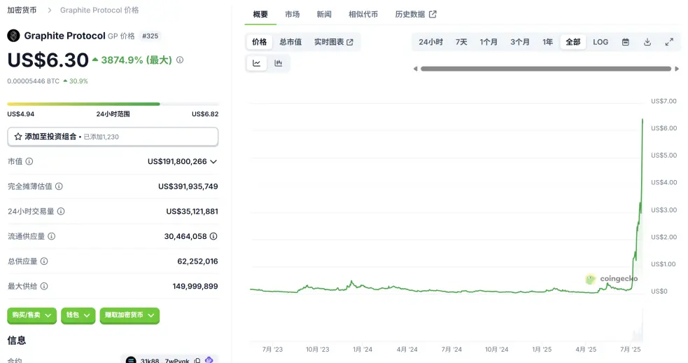 7 月,一个名为 Graphite Protocol ( GP ) 的项目在短期内获得接近 30 倍的涨幅,流通市值一度触及 1.9 亿美元。从 7 月 23 日起,几乎每天都在达到新的 ATH 。