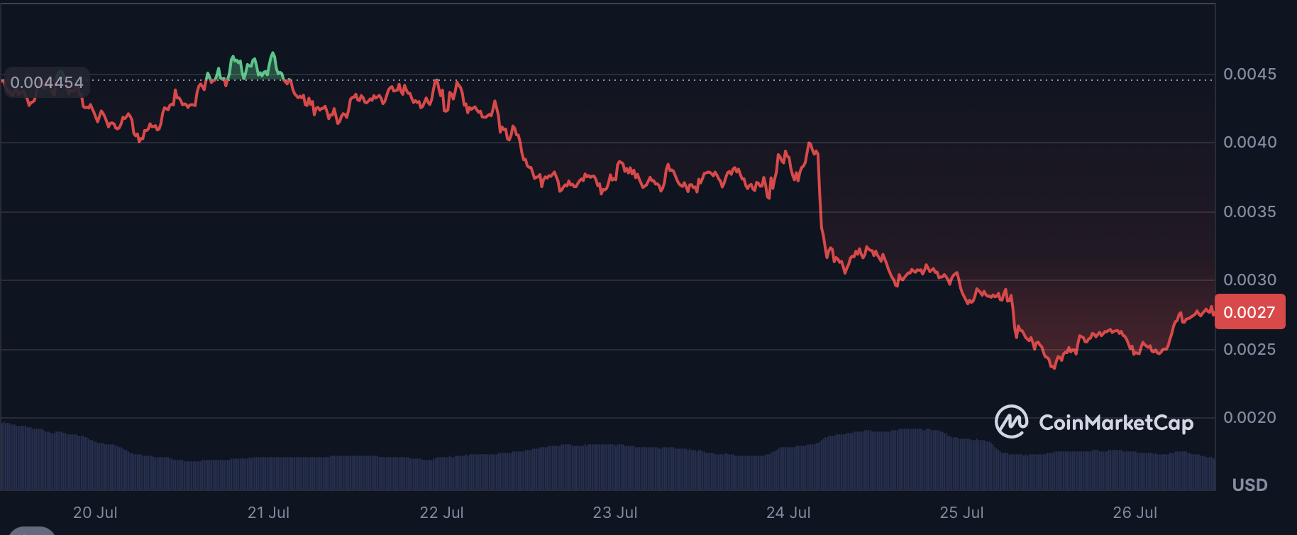 根据 CMC,PUMP代币的价格在过去七天下跌了约 37%,截稿前报价约 0.00275 美元。