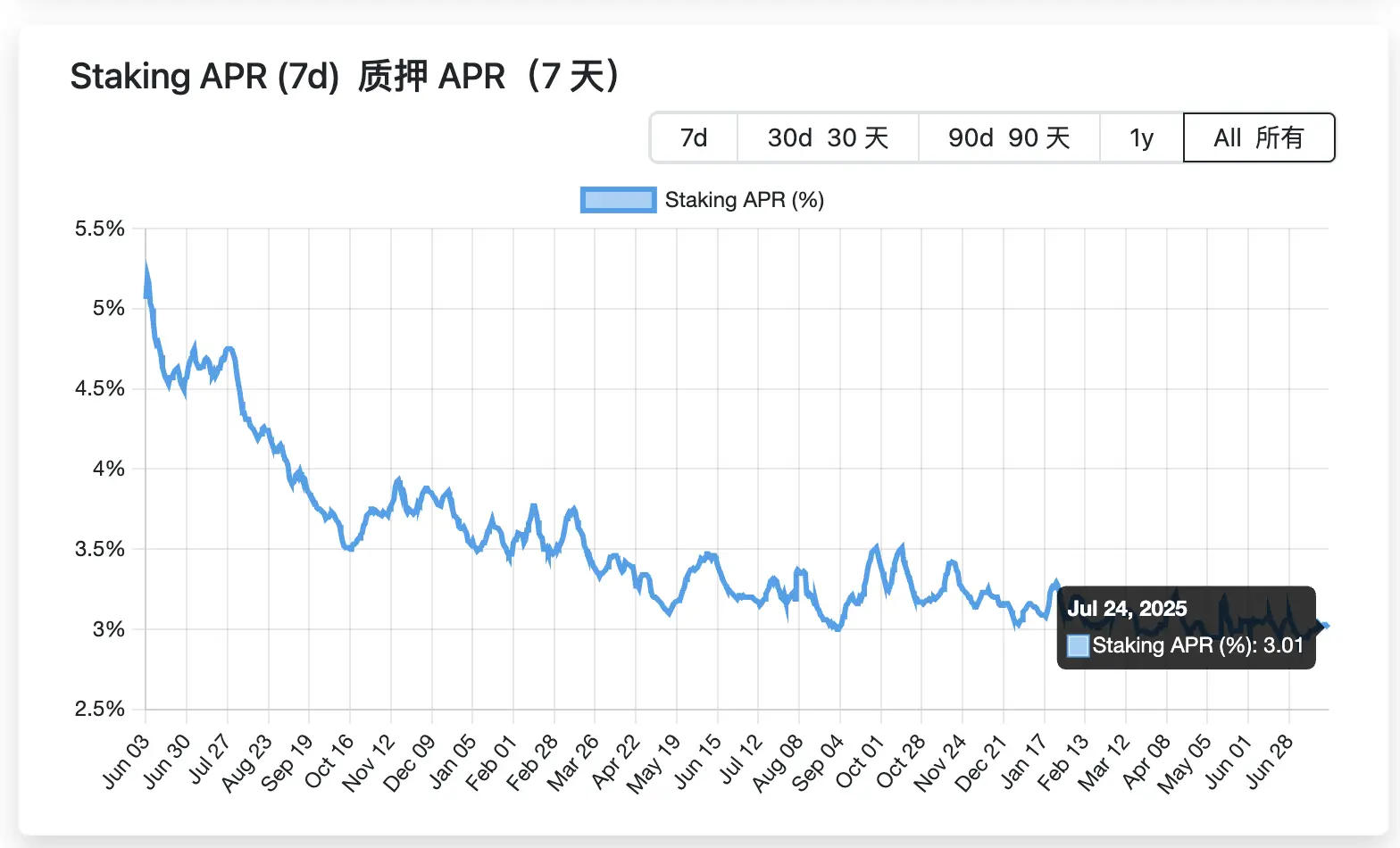 最后,则是 ETH 质押的 7 日 APR 收益变化。整体来看,ETH 质押收益率呈逐渐下降的趋势,这也符合 ETH 总量增加、质押总量增加的变化,由此质押收益摊薄。从 2023 年 6 月初的 5.2% ,目前该数据已下降至现在的 3.01% ,当然,相较于其他加密货币,ETH 的 POS 质押收益仍然是难得的“稳健型收益”,这也是诸多立志成为“ETH 版 Strategy”的美股上市公司的“生意经”——Sharplink Gaming 官方 昨日公布信息显示 ,其以太坊持仓数量为 360, 807 枚,并已通过质押产生 567 枚 ETH 的收益。