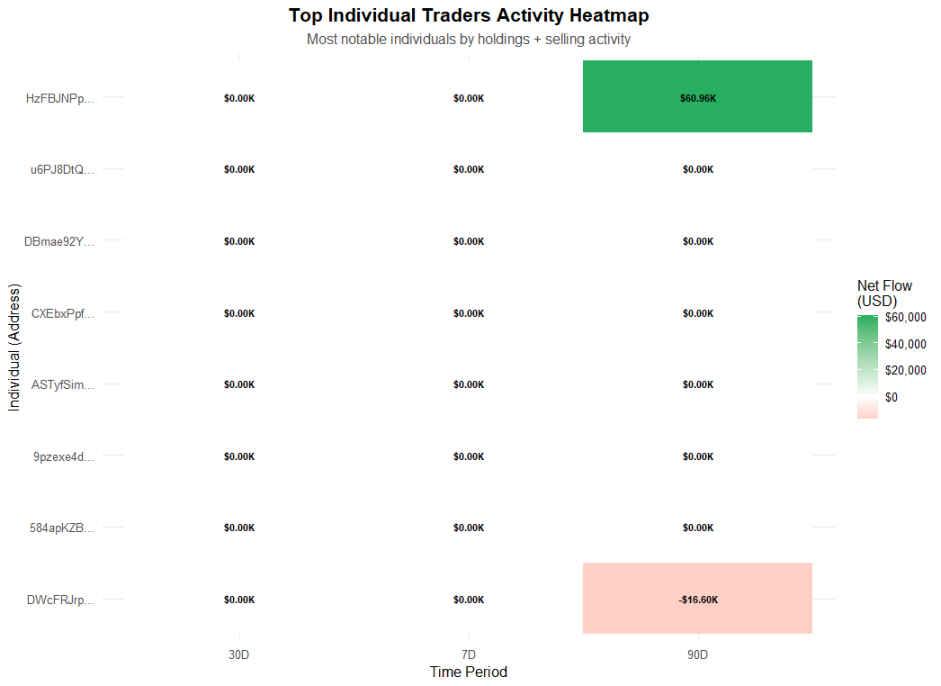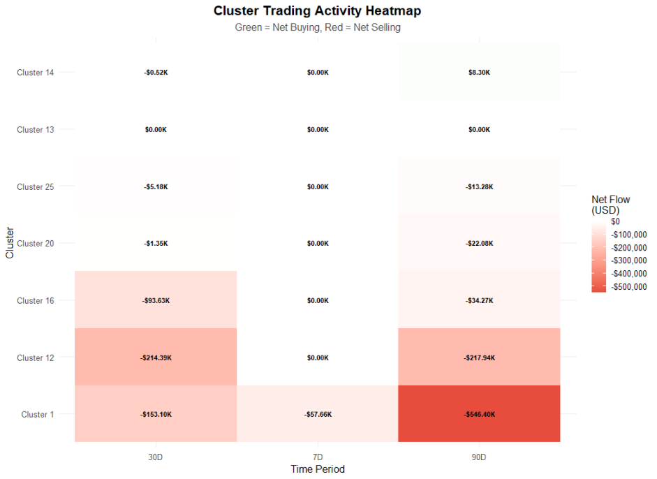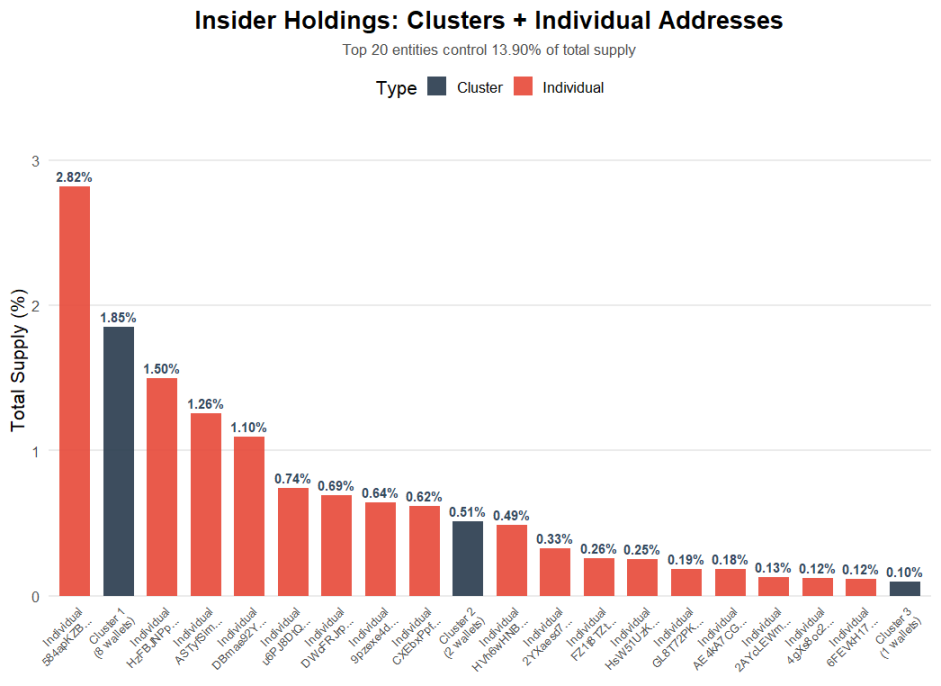 值得注意的是,大多数重量级 Insider 钱包并不属于某个集群,而是由个体持有。当前最大单一 Insider 钱包持有 2.82% 的供应量,而最大集群的持仓占比为 1.85%。这表明目前的筹码主要集中于少数个体而非有组织团体。