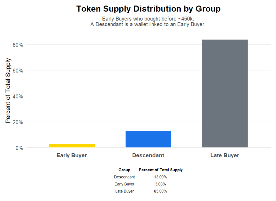 这也意味着,尽管确有「老鼠仓」在早期大额持仓,但并不存在「Bonk Cabal 控制全部筹码」的集中现象,「绝对垄断供应」的说法并不成立。