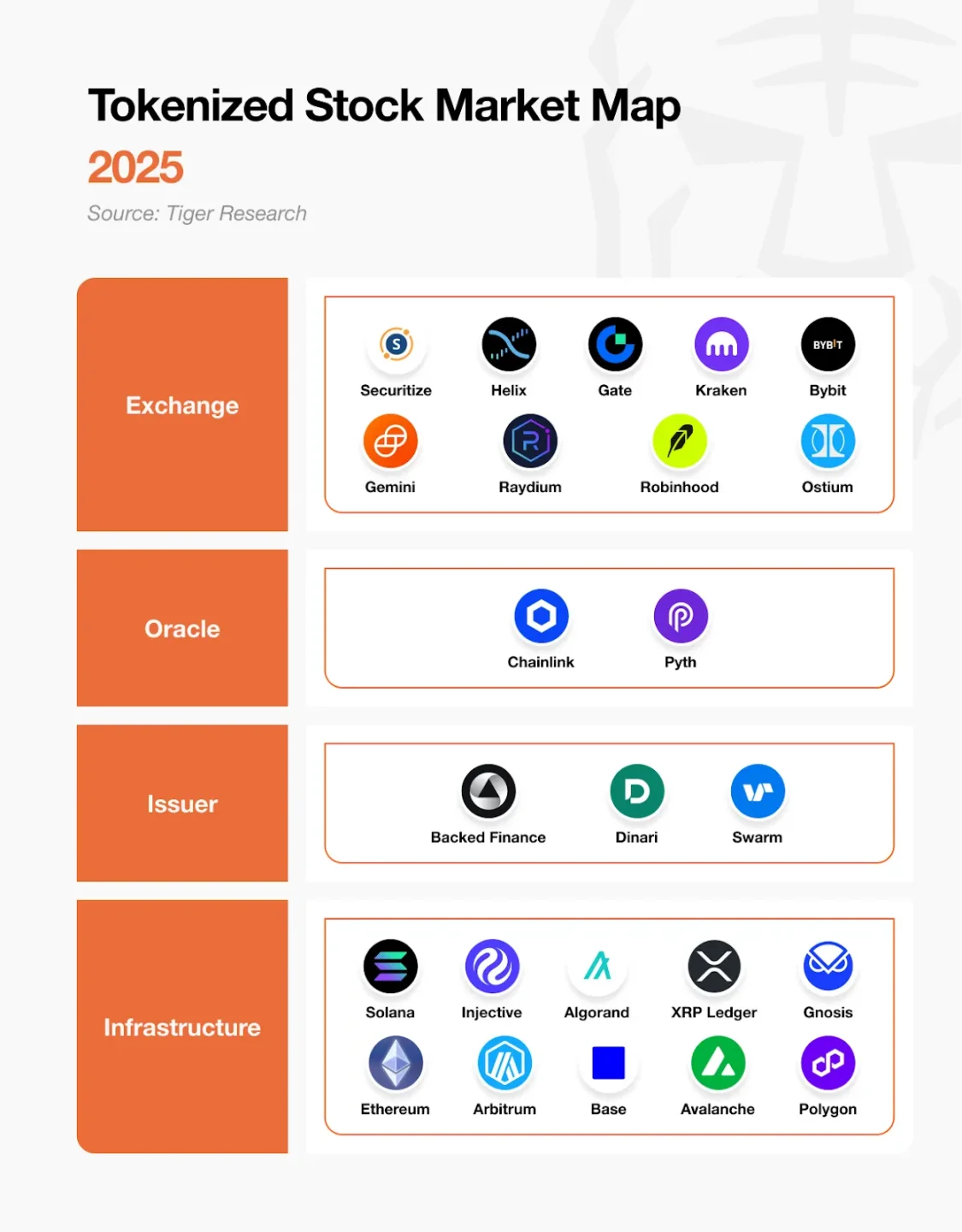 最底层是基础设施层,提供所有交易发生的区块链网络。其上是发行方,负责创建传统股票的代币化表示。为了确保准确的价格跟踪,预言机提供实时市场数据并维护与标的资产的链接。最后交易所允许投资者买卖代币化股票。