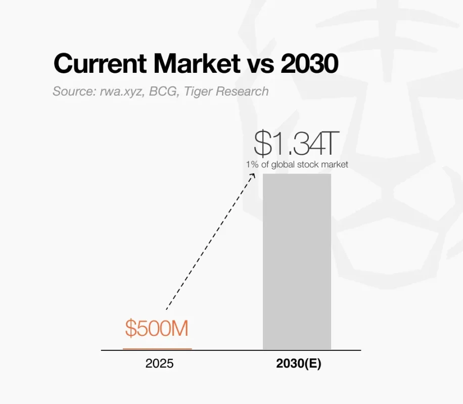 市场机遇:代币化股票市场目前规模为 5 亿美元,但如果全球股票中能够有 1% 的市场实现代币化,到 2030 年市场规模可能达到 1.34 万亿美元。这意味着 2,680 倍潜在增长,主要驱动力是 2025 年监管明确性和成熟的基础设施的双重推动。