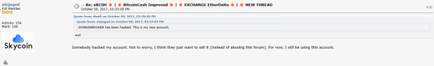 2017 年,eBitcoinCash 和 EthereumCash 这两个代币最初由加密论坛 BitcoinTalk 上的两个账号推广:DOMAINBROKER 与 ninjagod,二者均属于同一名用户。 根据一则论坛消息 ,在 DOMAINBROKER 账号「疑似被黑」后,该用户开始转用 ninjagod 身份与投资者沟通。
