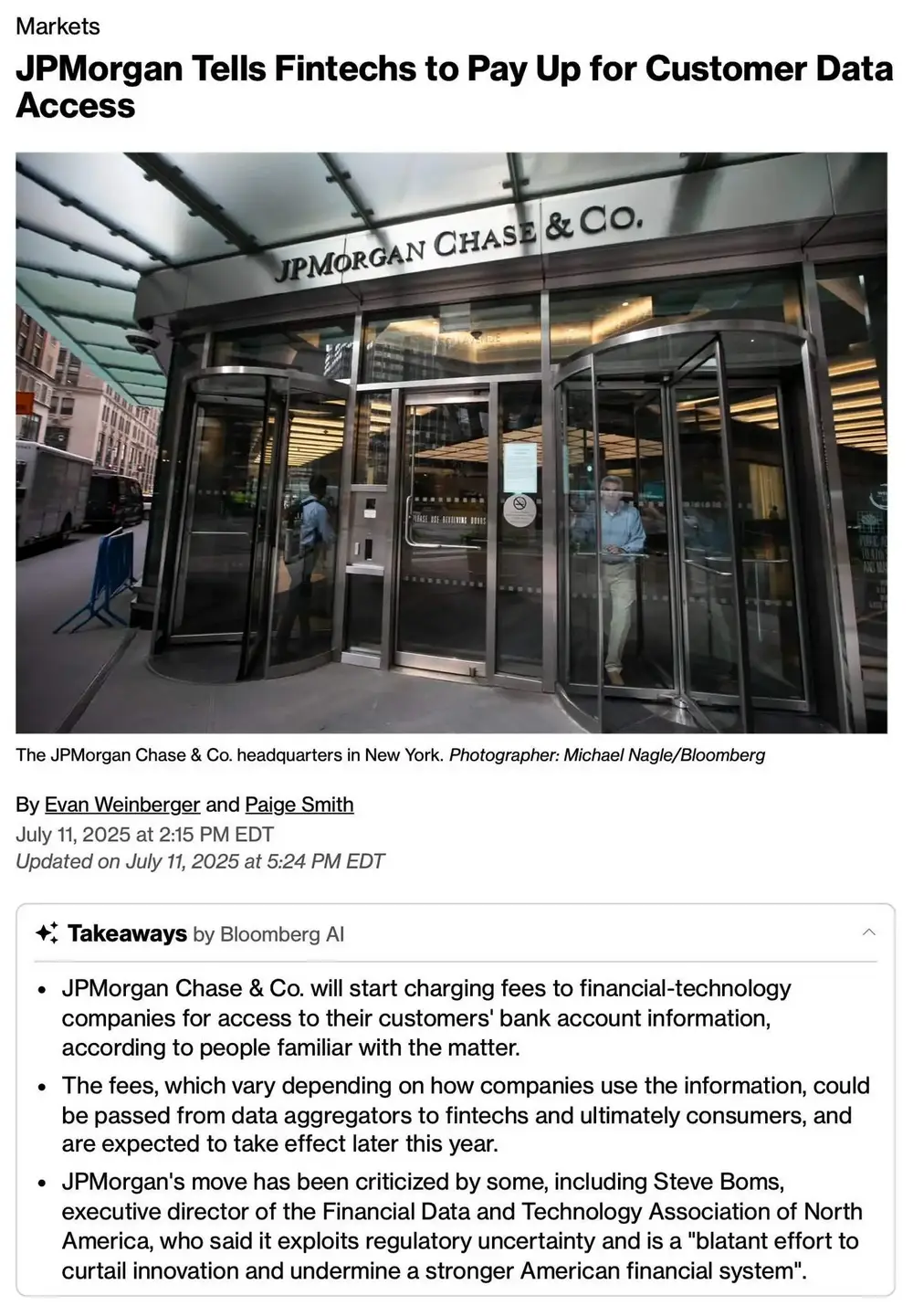 此举本意旨在通过促进竞争和消费者选择,降低贷款费用并改善支付、信贷和银行市场的客户服务,但客观上促使加密货币交易所等平台拥有免费访问用户银行数据等信息, 而现在,小摩给出的解法是,“想要用户数据?可以,拿钱来换!”