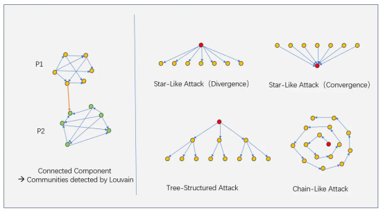 Trusta 通过社区检测 Louvain 算法和一些已知攻击模式分析资产转移图,以检测 Sybil 群集,如图所示:
