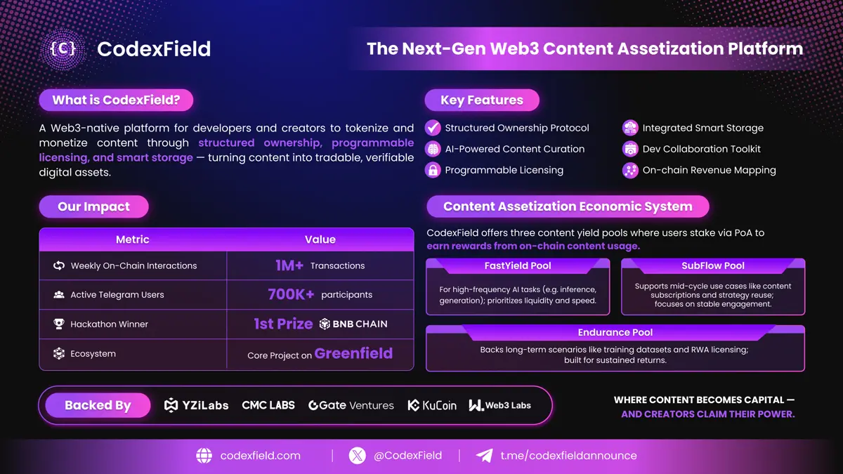 CodexField 构建于 BNB Greenfield 和 BNB Smart Chain 之上。其目标是实现内容的链上所有权确认、授权使用、交易流通与收益映射。我们正在重新定义“数字内容”,将其视为一种新型的现实世界资产(RWA)。该平台支持多种内容形态的标准化资产化,包括代码、AI 模型、AIGC 作品以及知识资产,并通过链上机制将使用行为转化为可验证的经济价值,推动信息向资产的根本转变。
