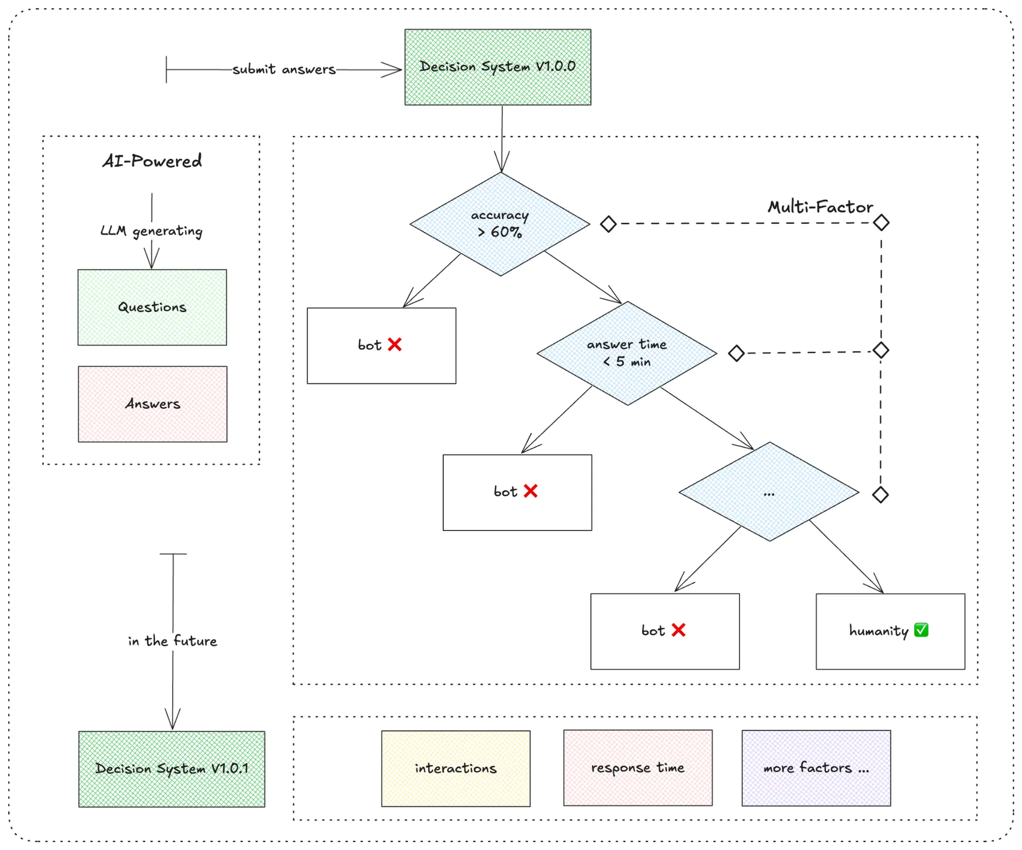 区分人类智能、智能不足的机器人(bot)和人工智能至关重要。为了应对这一复杂任务,我们确实需要多个模块的协同合作。