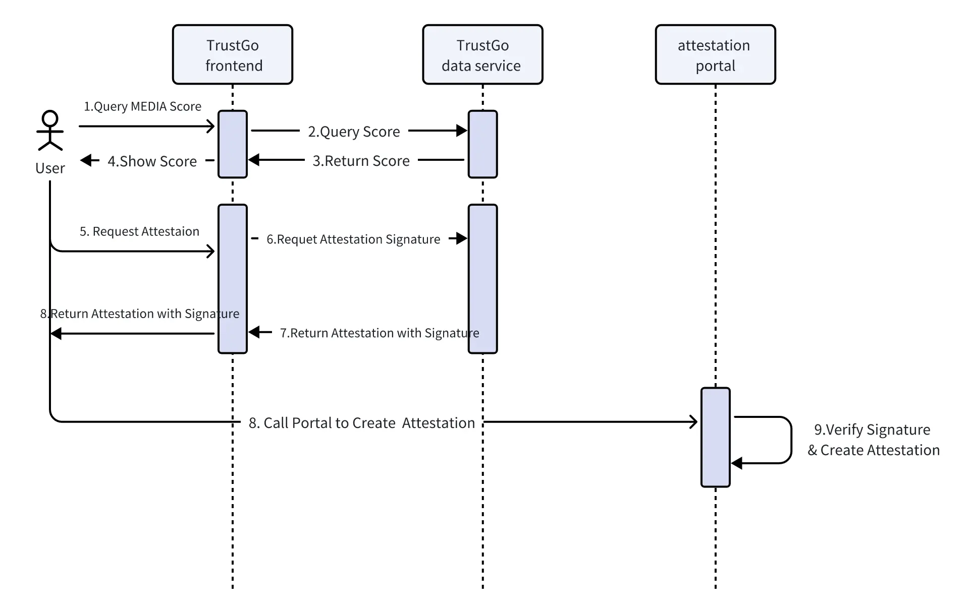 假设 dApps(如 TrustGo)已经部署了自己的 Portal 合约,用于发布验证,特别是 MEDIA 声誉验证。以下是用户申请并接收验证的步骤: